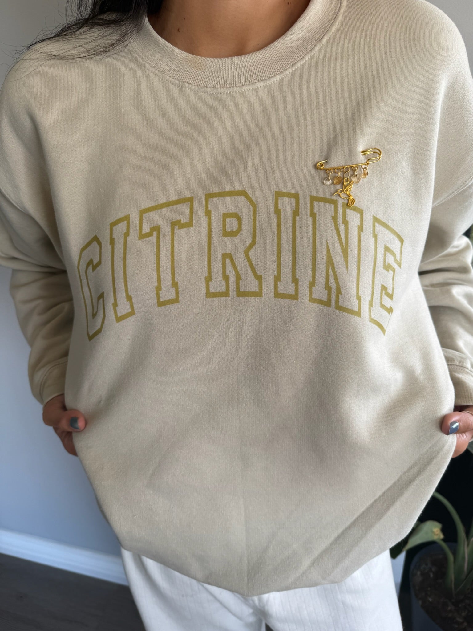 All sweatshirts come with citrine safety pins.